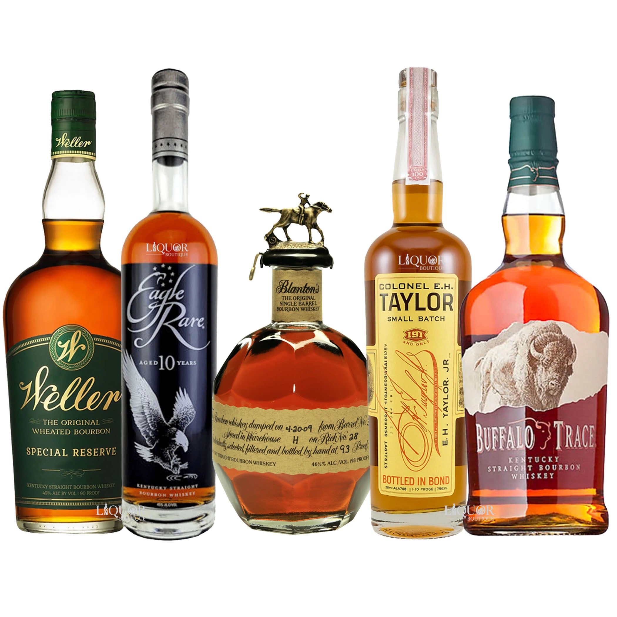 Five 750ml bottles: Weller Special Reserve, Eagle Rare, Blanton’s Single Barrel, E.H. Taylor Bourbon, and Buffalo Trace.